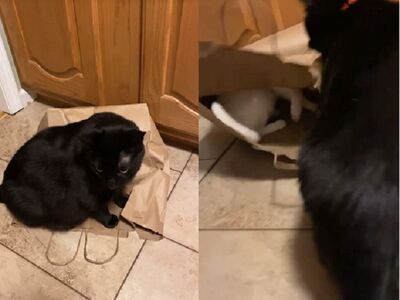 美國密西西比州的一位網友分享家裡兩隻貓「兄弟鬩牆」的日常。影片中名叫Jett的黑貓哥哥坐在地上,屁股下壓著一個看似空蕩蕩的紙袋,當飼主靠近袋子立刻發出可疑的噪動聲,這下才發現原來是牠把自己的親弟弟Yeti關在裡面了!