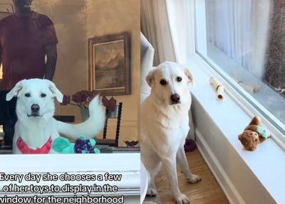 國外一隻叫做內莉(Nellie)可愛狗狗原本是一隻流浪犬,獲得主人收養後擁有一個快樂的家,還有好多牠最喜歡的玩具,幸福的牠每天都會叼一、兩個最喜歡的玩具到窗戶邊,向路過的鄰居炫耀收藏。