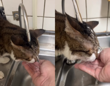 虎斑貓「魚肚」有個讓人摸不著頭緒的喝水習慣,明明家裡已經有流動飲水機,牠卻偏偏堅持要喝流理台出水管的水,還非得把頭堵在出水口,一邊喝水一邊任憑水流「洗頭」,讓人看了又無奈又好笑。