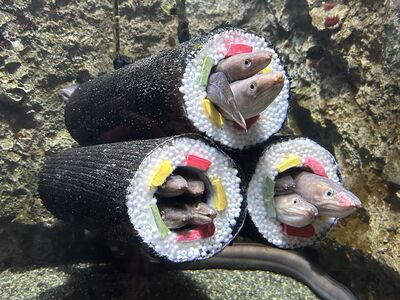 每年立春前一天是日本的「節分日」,人們會吃惠方捲來祈求新一年的幸運。日本仙台水族館為了慶祝節日到來,於是利用星鰻愛鑽洞的天性,在牠們的魚缸中設置了惠方捲造型的躲避屋,讓鰻魚們瞬間化身活蹦亂跳的「食材」。
