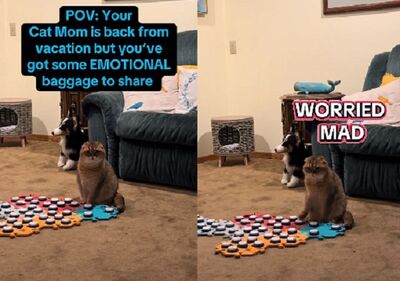 對部分飼主來說,寵物發聲按鈕是跟毛孩溝通的橋梁之一。這天蘇格蘭折耳貓Puffin發現媽媽在收行李準備出門,於是自己走到按鈕前,有條理、按順序地「說」出自己擔心她的安危、更因為自己一貓在家感到沮喪,讓奴才越來越心虛。