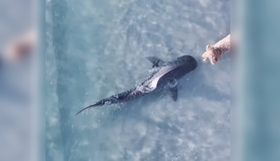 澳洲珀斯海灘發現驚人的一幕,無人機拍到一條鯊魚突然出現在淺水區,與在水中嬉戲的一隻貴賓犬正面相遇,鯊魚與狗狗相距只有幾公分,主人只能無助看著事件發生。