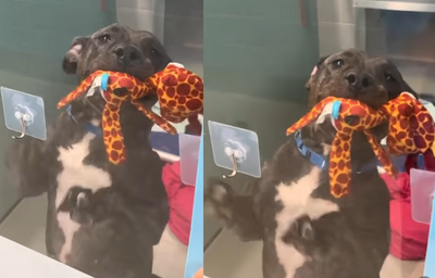 美國紐約動物收容所近來分享一支令人難忘的影片,收容所中一隻叫做Pond的狗狗,看到有訪客出現,親人又友善的牠立即叼著自己最喜歡的長頸鹿娃娃,開心搖著尾巴向訪客們炫耀,彷彿在獻上「友誼的禮物」讓牠爆紅。
