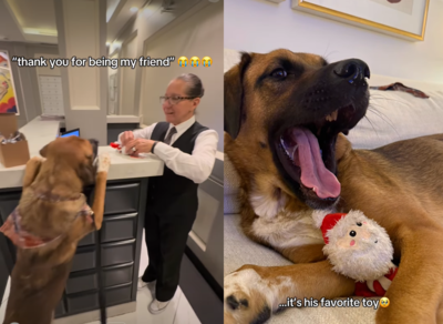 美國紐約一隻叫做Goose的牧羊犬是超級E狗,平常散步時超喜歡把頭探向窗戶,看看鄰里間在做什麼,這天牠從最喜歡的公寓管理員Isabel那裡收到聖誕玩偶,這讓牠開心得整天抱著玩偶睡覺,飼主看出他們的好感情,便決定幫Goose準備回送禮物,一來一往間成為聖誕節前夕最溫暖的「交換禮物」。