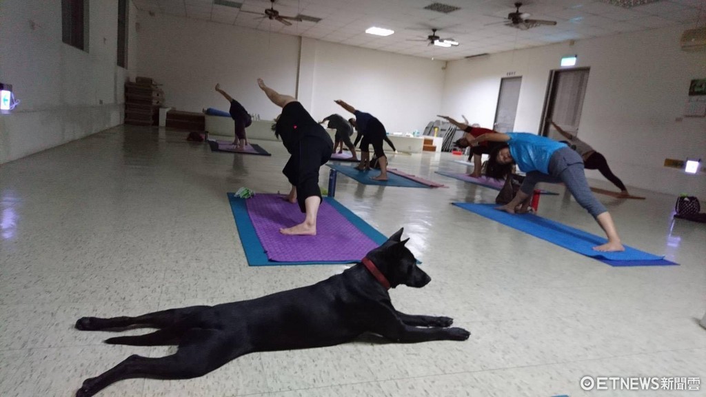 瑜珈教室要求沉靜,通常不會讓狗狗參加,不過黑美人「菱角」是教室裡大家最寵愛的「同學」,牠有時伸個懶腰示範正港「下犬式」,而大部分的時間都是「五體投地」趴著伸展放鬆,大家看到牠的姿勢總是想笑,努力把動作做確實,不能被這位汪同學比下去了!