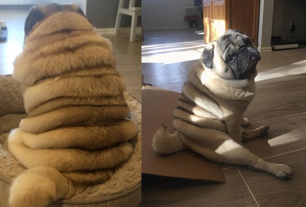 6歲的Theo是隻巴哥犬卻自帶「沙皮狗」的皮膚,趴下身上竟然可以擠出超過5層「游泳圈」,坐下更是不得了,從後面看竟然能分出10層,如此肥美的身材讓人看了都情不自禁揚起嘴角。Theo除了驚人的游泳圈,牠還是個特別發懶的孩子,總是趴在沙發上呼呼大水,還因為下盤太穩,坐下後腳都能伸直張開開,姿勢像人一樣,水汪汪的眼睛無辜地看著人,誰能不被這顆鮮美的「蚵仔」迷倒。
