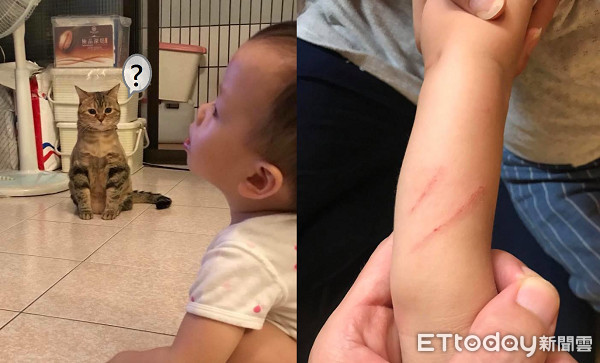 ▲1歲半的Sean摸貓被賞了一記貓拳。(圖/網友Cheng-Dar Liu授權提供,下同)