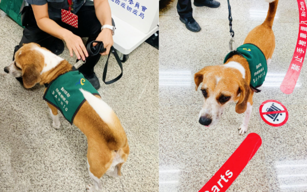 網友Ellie Chinen在臉書公開社團「有點毛毛的」分享照片並寫道,「因為剛剛入境出關前我手提著一袋含有魚類製品的東京伴手禮,狗狗火速帶著2女1男的防疫檢驗專員跑過來,坐在我面前舔舌頭看著我」,直到她打開行李,女防疫檢驗專員微笑著溫柔的跟狗狗說,「沒有肉肉,我們走了~」,這孩子表情瞬間失落,默默的站起來靠近行李,皺著眉頭彷彿在問,「真的沒有帶肉肉嗎?沒拿到獎勵了…」畫面相當可愛。