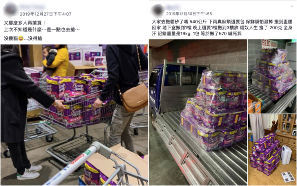 然而在「紫包」特價的消息曝光3天後,就出現最強貓奴向網友示範何謂「爆買一波」!在聚集全台最多鏟屎官的公開社團《貓咪也瘋狂俱樂部》上,有網友PO出自己開卡車載貓砂的畫面,PO文還不忘溫馨提醒「大家去搬貓砂了嗎」。只見這位不顧下雨天也要掃貨的網友,不僅把將近30包的貓砂搬上卡車後座,怕礦砂被雨淋濕的他,還準備了保鮮膜將紫包們層層包起,PO文也呈現他累歪的心情,「搬到歪腰回家,地下室搬到1樓,晚上還要1樓搬到3樓放。」算了算,一包紫包19公斤,近30包的量共約540公斤,買成這樣讓朝聖的網友全跪了,紛紛表示「哥~這個量太大了」、「我才買兩包,好像買太少了……」原PO也回應,自己家有6隻屎尿多的喵星人,加上紫包的香味不至於太重,屁貓們都喜歡,所以就趁優惠期間買進幾個月的量,慢慢囤著用。