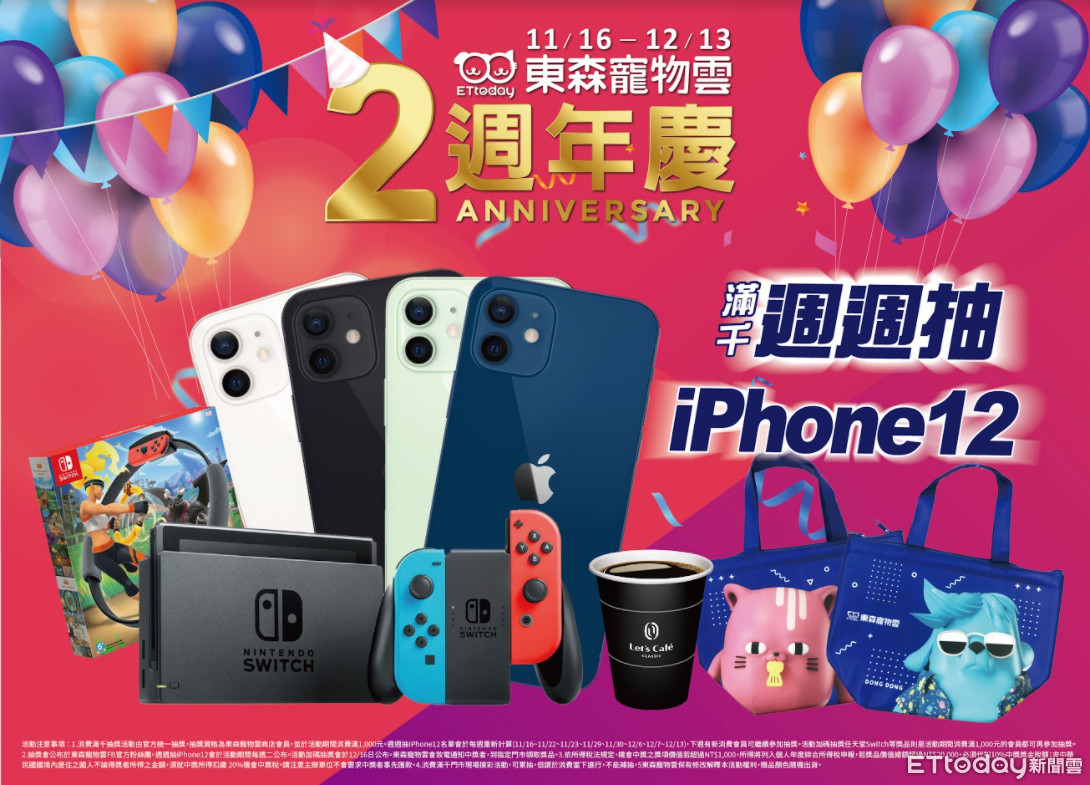11/16(一)-12/13(日)週年慶期間,消費滿1000元就能參加iPhone12抽獎,另加碼再抽任天堂Switch健身環組、HP多功能事務機、東森幣300枚等大獎。此外,消費滿1000元還能現場摸彩,有機會獲得全家中杯熱咖啡、寵物洗澡半價券、包月8折券、住宿8折券、零食主食罐等多項好禮直接帶回家。消費滿1500元再送您限量「東東森森Q萌保冷袋」。