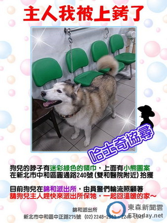 這是新北市中和區錦和派出所的協尋海報,透過臉書(Facebook)的分享散佈,贏得許多網友的讚賞,也很快在只隔一天的時間,就讓哈士奇與主人易先生團圓。哈士奇交保不候傳,希望牠別再走失了。