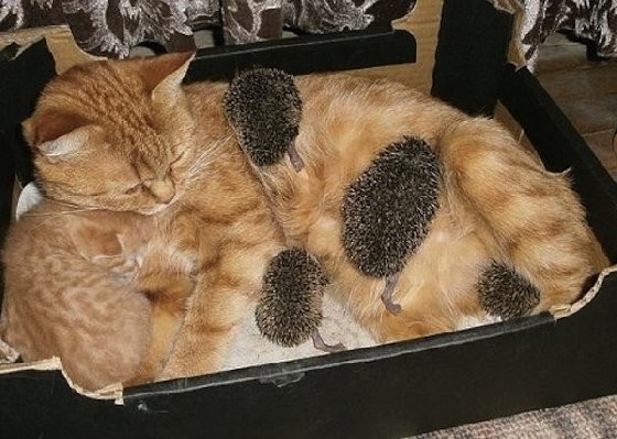 貓咪身上鑽來鑽去的這四顆黑毛球是什麼呢?答案是四隻小刺蝟。住在俄羅斯中部的金色母貓Sonya,收留了無家可歸的這四隻小可憐,無私地照顧哺育牠們,讓小刺蝟不至於在野外孤單夭折,來看看Sonya和養子們的溫馨系列照吧!