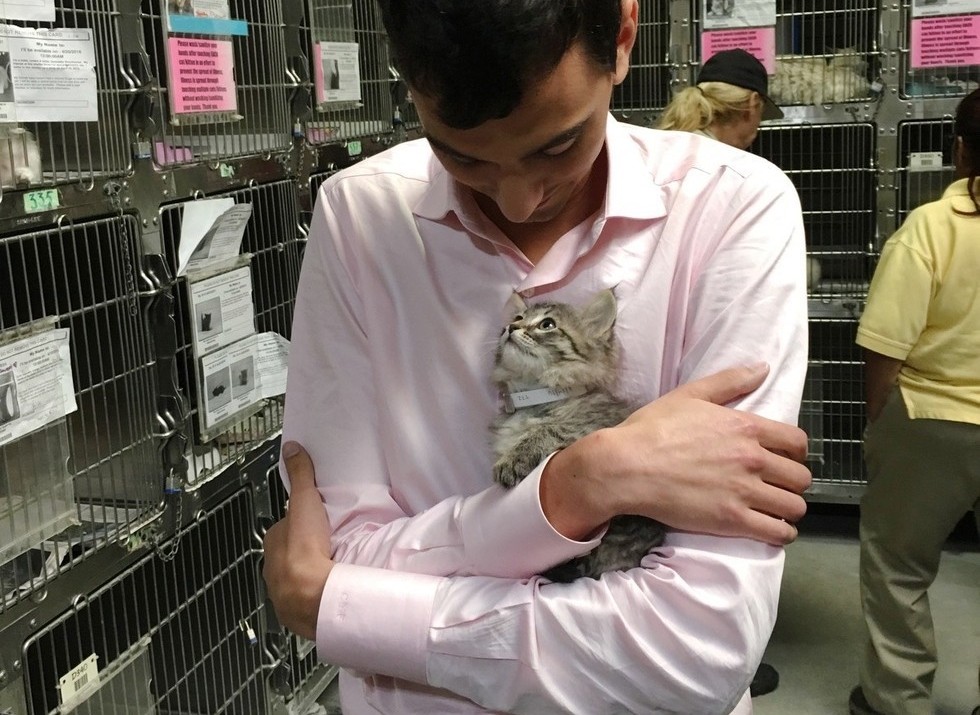 這眼神實在是必須要立刻抱緊處理的啊!一名男子日前去加州唐尼(Downey)一間收容所領養貓咪,馬上就被這隻眼睛和星星一樣閃亮的小貓給吸引住了,而當他將這個小可愛抱在懷裡時,牠抬頭看著這個未來貓奴的模樣實在是超有愛,讓人完全沒有辦法拒絕帶牠回家!