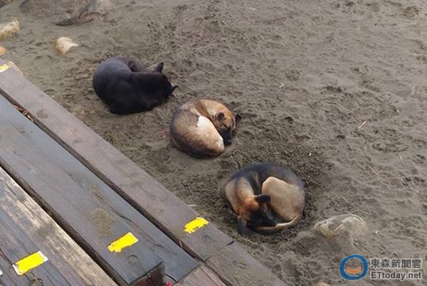 國慶連假除了下雨以外,氣溫也轉涼許多,不過對於流浪狗來說,秋冬的到來也是另一種程度的考驗。網友劉子榕10日帶著家人到新北市八里走走,到渡船頭時就看到幾隻流浪狗在沙子挖了坑,整個身體蜷縮成一團取暖睡覺,就像是一串丸子一樣,讓人看了心疼不已。