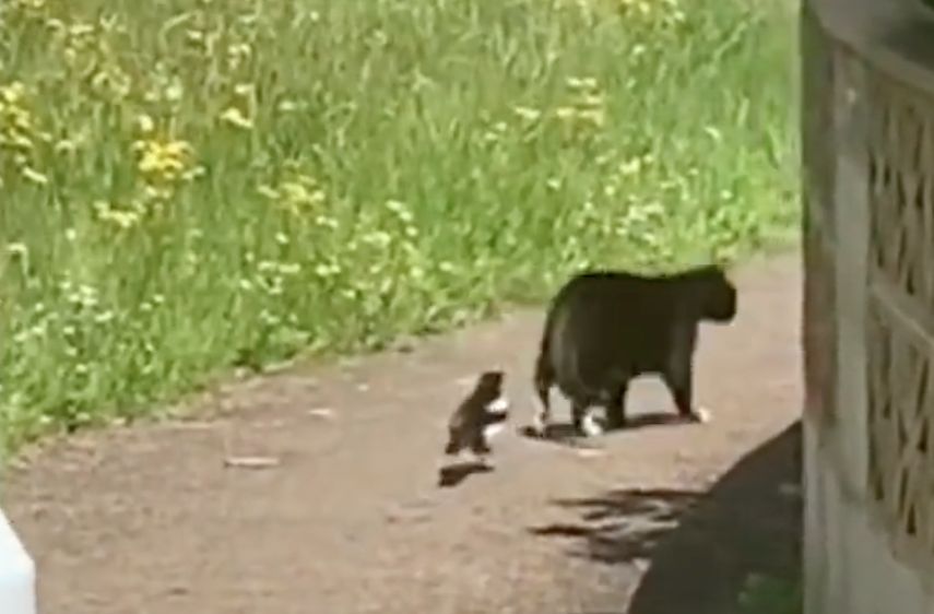 大陸微博博主「我與老公的日常」,近日分享了一段一分鐘的短片,畫面中可以看到黑白花紋的貓咪正在享受和煦的日光浴,悠閒地散步在小路上,而後頭突然多了一隻喜鵲默默地跟著牠,貓咪走沒幾步就發現後面多了一個生物,立馬警戒地轉身看向喜鵲,喜鵲像是沒事般撇頭看向另一旁的風景,發現自己「跟蹤」成功後,喜鵲安心地一路用同樣的招式迴避貓咪的視線。