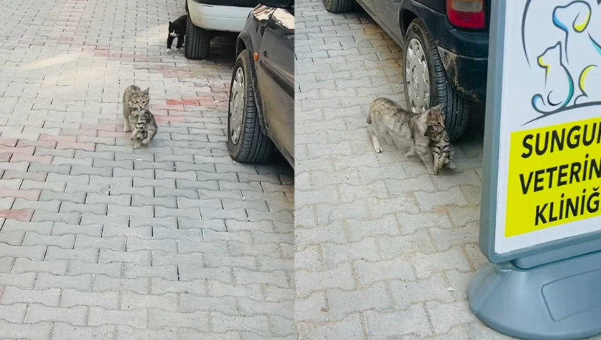 土耳其一名獸醫意外在診所外面拍到,一隻貓媽媽口中叼著一隻生病小貓,搖搖晃晃地來到診所前求救,他們趕緊把所有貓帶進屋內檢查,結果發現小貓眼部感染,感人畫面在網路上爆紅。