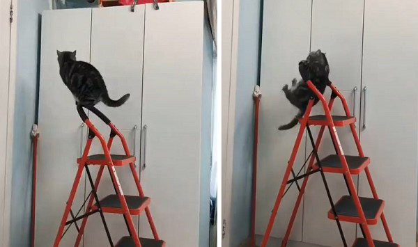 ▲喵主子站在A字梯的最高點,看起來相當有氣勢。(圖/翻攝自抖音用戶「367624239」,下同)