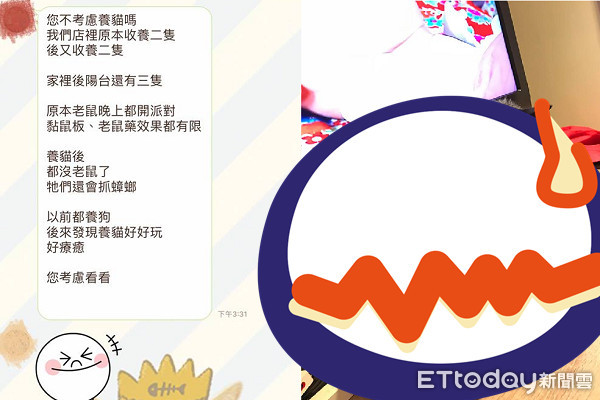 林小姐受訪時表示,近半年來感覺家中老鼠數量變多,使用黏鼠板、捕鼠籠效果不明顯,剛好近日要請廠商清洗冷氣,於是想打聽看看是否有認識的公司可以幫忙。從照片中可以看到,冷氣商非常熱情地推薦林小姐可以試試看「養貓」這個辦法,大力稱讚貓咪可愛又會幫忙抓蟑螂老鼠,林小姐看見這個辦法無奈地回應,「我們家也有養貓,但是牠怕老鼠」,因此整個方法宣告失敗。