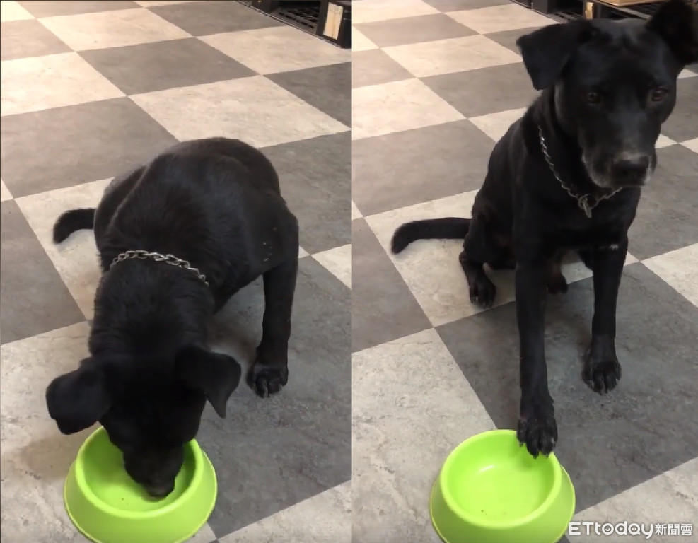 影片中,黑嚕嚕坐在綠色碗碗旁,一臉認真盯著前方看。只見牠用小小的狗掌拍拍狗碗,發現媽媽怎麼還不倒飼料,再次「多敲幾下」,最後還激動到一直推碗,「催促給飯」的樣子超可愛。