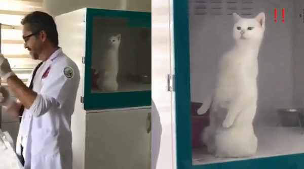 打針是每一位小孩的惡夢,連毛小孩也是!國外日前在網路上流傳一段神之可愛的影片,內容中一名獸醫轉身正在配藥,準備要幫生病的貓咪打針。有趣的是,櫥窗中待診的白貓走到最角落,「前腳起立」看著眼前的針筒,驚恐到不行的表情笑翻一票網友!