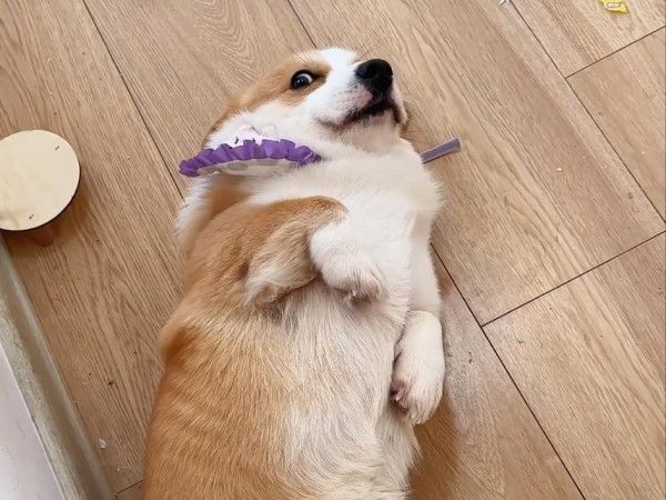 ▲柯基Coffee被發現在拆家,馬上心虛的翻肚肚先示好。(圖/翻攝自小紅書/小柯基Coffee)