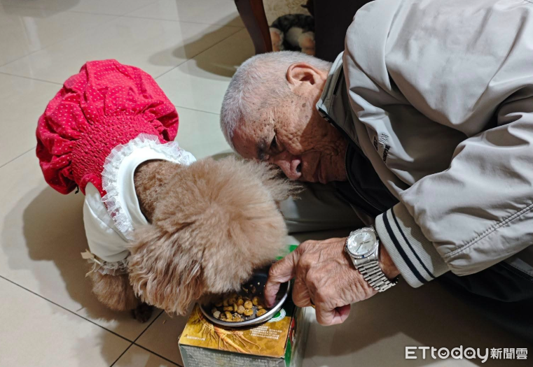▲白髮爸溫柔哄毛孩快乖乖吃飯。(圖/網友王秀盆提供,請勿隨意翻拍,以免侵權,下同。)