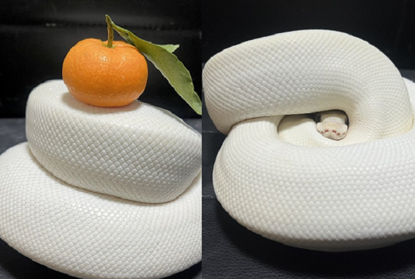 日本網友Togi(トギ)養了許多特殊寵物,其中包括了一隻稀有的白蛇,當時正值日本的新年假期,於是他突發奇想,讓這隻蛇扮演日本過年時必吃的「鏡餅」,這是一種類似麻糬的食物。當他在替蛇身上放了橘子後,神似的樣子瞬間吸引網友們的注意。