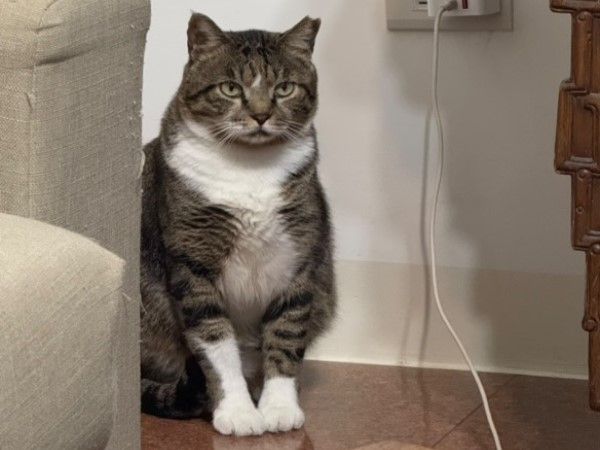 台南市2歲白底虎斑米克斯「罵丸」是被收編回家的浪浪,這天爸爸在和牠說話,牠很認真的立正仔細聆聽,但表情看起來超級不耐煩,網友注意到牠一高一低的白襪,笑說像是被老師勸導服裝儀容的學生。