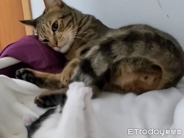 寶寶委屈但寶寶承擔!桃園市有一對貓兄妹,分別是2歲的虎斑「兩點」和3個月的「汪汪」,2隻毛孩的個性天差地別。這天兩點舒服地躺在棉被上,調皮的汪汪跑過來玩牠的尾巴,無奈的哥哥一臉「放棄貓生」,厭世的甩動尾巴哄妹妹,放棄掙扎的模樣彷彿歷經滄桑,搞笑的一幕剛好被記錄下來。