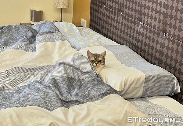 ▲鏟屎官要出門上班,卻發現貓咪早已自己進被窩裡躺好。(圖/愛福人士提供,請勿隨意翻拍,以免侵權。)