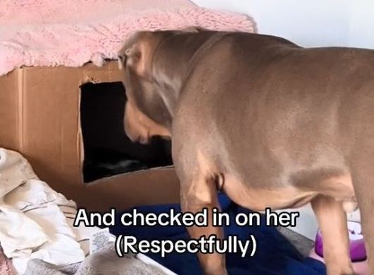 TikTok帳號@justgunnerstunner分享的影片中,Gunner發現家裡的孕貓開始出陣痛的跡象,立刻鑽進貓咪的房間守護,不過為了安全考量,主人選擇先把Gunner帶離房間,結果貓媽媽馬上忍痛跑出來尋找狗狗,還不停喵喵叫。最後飼主只好妥協,Gunner似乎也知道貓咪需要休息,於是自動保持距離陪伴,每隔一段時間就小心的湊近產房觀察。