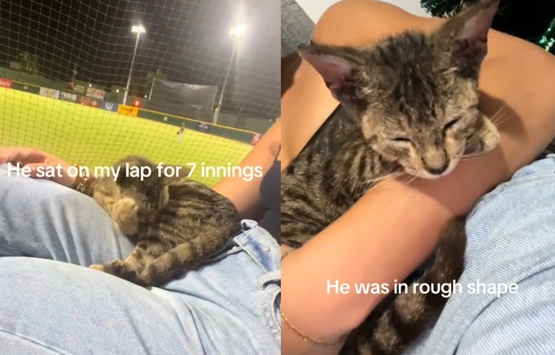 來自美國肯塔基州的女子魯莫羅(Nat Rumoro)在網路上分享,她到外地看棒球比賽時,意外被貓咪欽點當鏟屎官的故事。影片中可看到,魯莫羅坐在球場時,一隻親人的虎斑貓突然跳到腿上,一直趴著不肯離開。