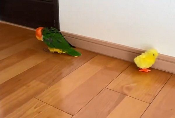 日本大阪的凱克鸚鵡Maro對家裡的小雞玩具又愛又恨,這天主人開啟玩具的震動開關,第一次看見小雞動起來的鸚鵡嚇到不停倒退,繞了一圈後卻發現自己反而離它更近。