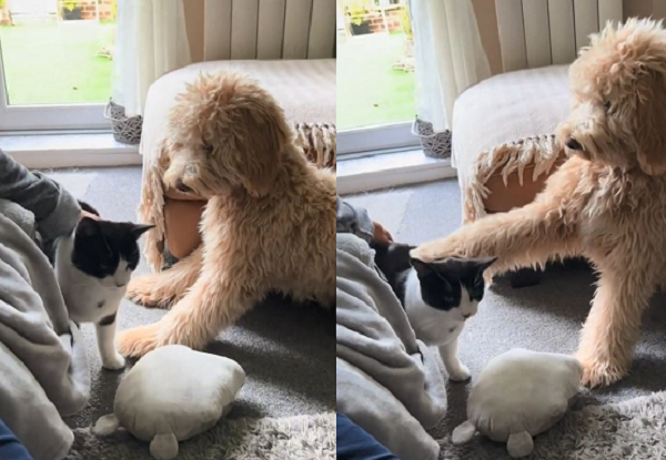 英國汪星人「貝利」是隻溫柔的貴賓狗,同時也有很強的學習能力,這天飼主露西帶著牠跟媽媽養的賓士貓「凱文」相見歡,結果貝利發現主人都在摸貓,於是也有樣學樣的伸出小手嘗試擼貓。