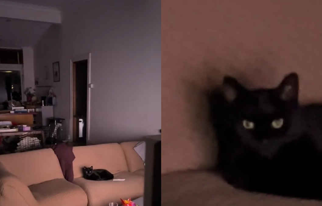 影片中可看到,連恩下樓後發現,一片黑暗中只有客廳傳來亮光,他小心地朝客廳走去,看到所養的黑貓在沙發上看電視,而且發現他後反應非常冷淡,似乎不太爽電視看到一半被打斷。