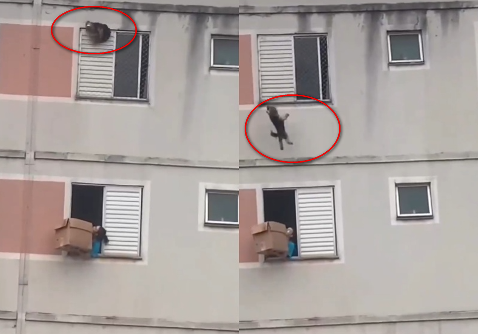 巴西發生一起驚險事件,一隻主人不在家的狗狗不小心跌出公寓窗戶外,受困在窗台外的模樣引發附近民眾圍觀,眼看狗狗就要墜樓時,幸好樓下女鄰居眼明手快拿出紙箱及時接住,畫面在網路上瘋傳。