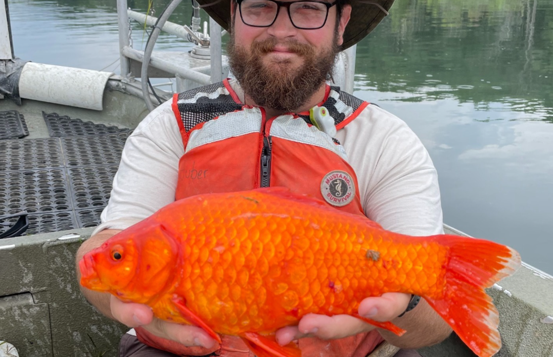 美國魚類與野生動物管理局(USFWS)26日在臉書上分享,他們在賓州伊利市(Erie)州立公園Presque Isle State Park的水道中調查時,捕獲到這條巨大金魚。
