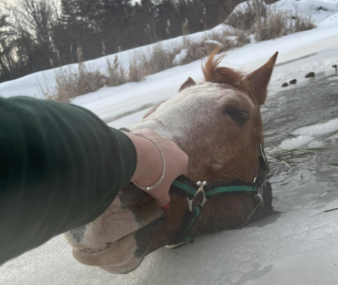 美國紐約北部日前下雪湖面結冰,Ali Ernst從窗戶看到馬兒Sly自己走到農場的結冰湖面上,她正擔心馬兒會墜入冰湖,就目睹隨著馬蹄踏下冰層破裂,Sly就這麼落入湖中,僅剩一顆頭勉強露在外面。