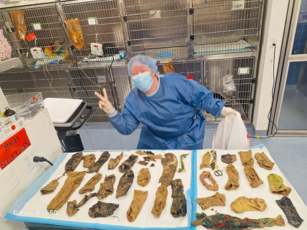 IG@coronaanimaler分享貼文,獸醫師在觀看檢查結果後,當即對Luna採取治療,透過「腸造口術(Enterotomy)」和「胃造瘻術(Gastrotomy)」發現,在牠的體內可不只有襪子那麼簡單,還有1條大腸髮圈、2條一般髮圈、3片鞋墊、一些小的衣物碎片,其中在腸道內還發現了一件嬰兒的衣服,異物總數量高達44件。