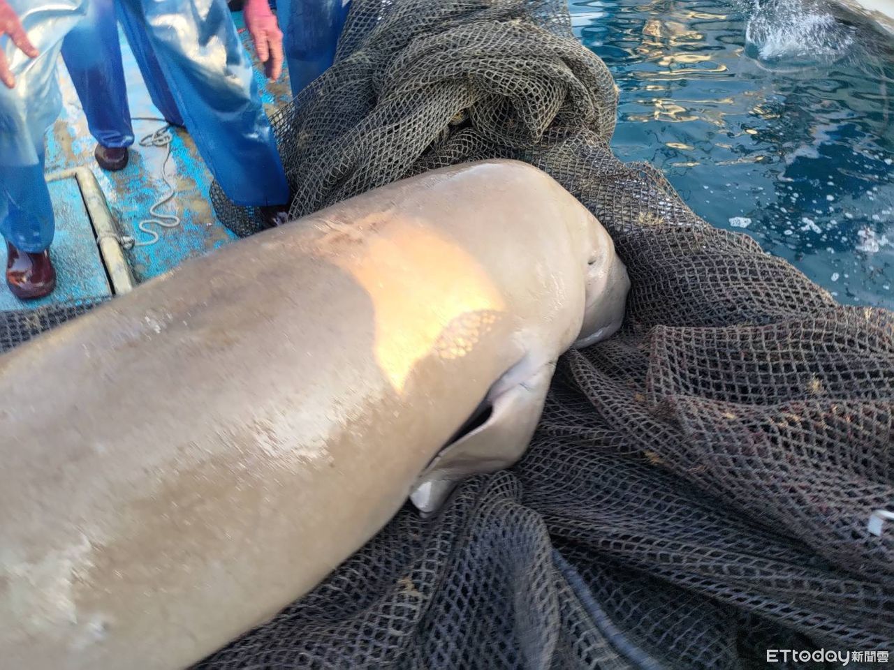美人魚時隔88年再現宜蘭!25日清晨,一尾長約3公尺、體重約500公斤的印度太平洋「儒艮」,誤闖距離岸際約800公尺的宜蘭粉鳥林定置漁網,漁民驚喜發現後,立即將其野放。