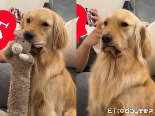 台北市1歲半黃金獵犬Cody叼著兔子娃娃,想邀奴才一起玩卻被忽略,牠氣得把玩具丟在一旁,表情秒變「苦瓜臉」,看起來真的很不開心。飼主無論怎麼哄都沒用,最後還是認命陪玩,得到滿足的Cody才終於開心起來。