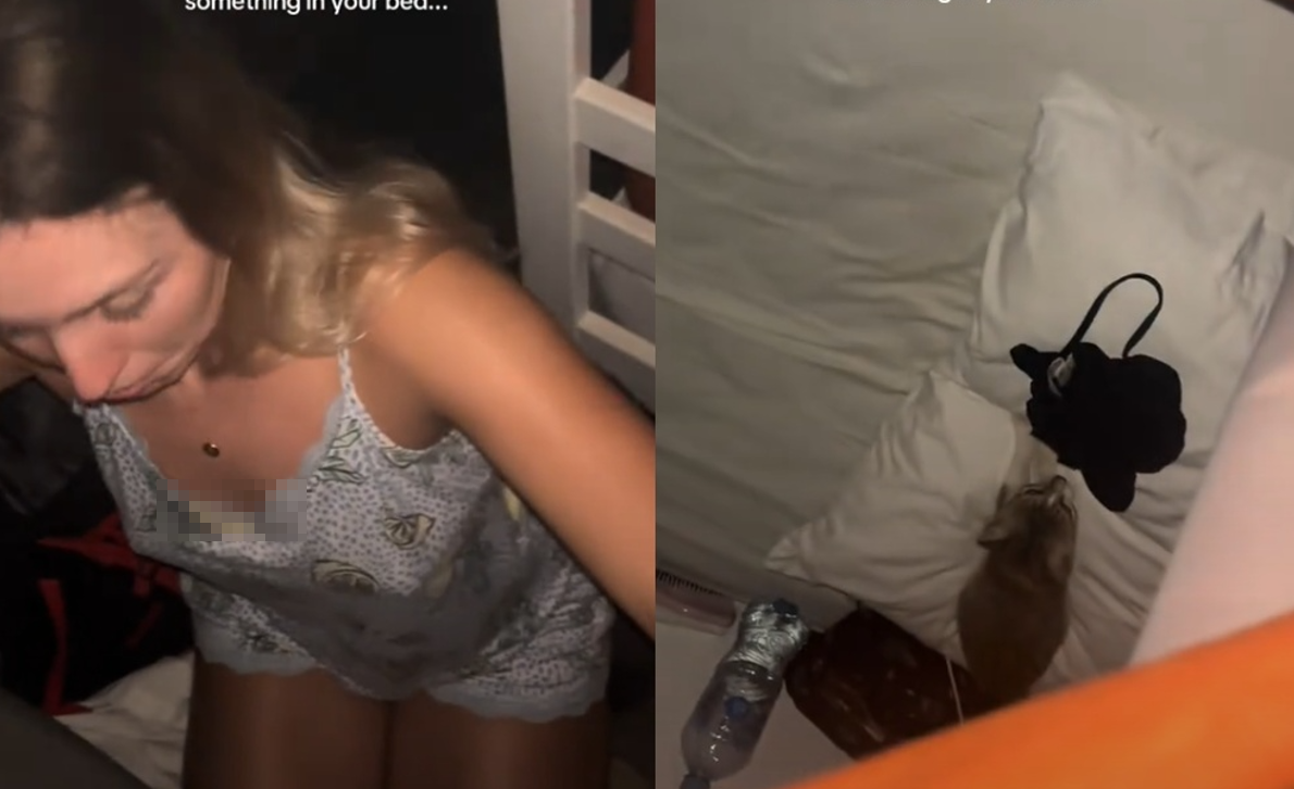 女網友@izbuckley在TikTok上分享,她在瓜地馬拉入住青年旅館時遇到的驚嚇事件。影片中可看到,女子半睡半醒時,突然感覺有東西爬到床上,嚇得她立即醒來。