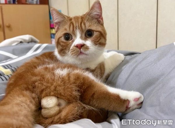 橘白貓「腿庫」是隻7個月大的小男生,尚未結紮的牠擁有肥嫩嫩圓滾滾「雙色鈴鐺」,還分別是水煮蛋與茶葉蛋口味。經過鏟屎官Karen的偷摸經驗,這兩顆巨蛋彈性與柔軟度兼具,觸感超級療癒。