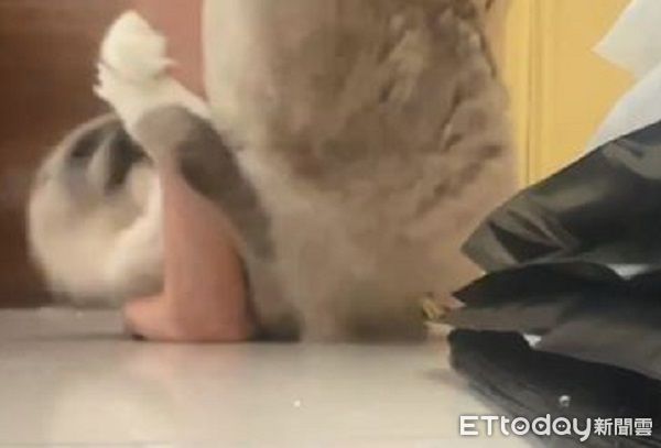 歐力看見正在運動的飼主,立刻靈活地撲過來抱緊她的手臂,用頭下腳上的高難度姿勢用力踢踹,似乎是想讓奴才欣賞自己的好身材。然而貓咪尖銳的爪子對人的手臂實在不友好,讓媽媽忍不住大呼「很痛!」。歐力媽媽告訴《ETtoday寵物雲》,自家貓皇非常喜歡嚇人,除了趁鏟屎官運動時突襲,「平常會躲在門後偷襲我跳起來抱大腿,然後再跑走 」。