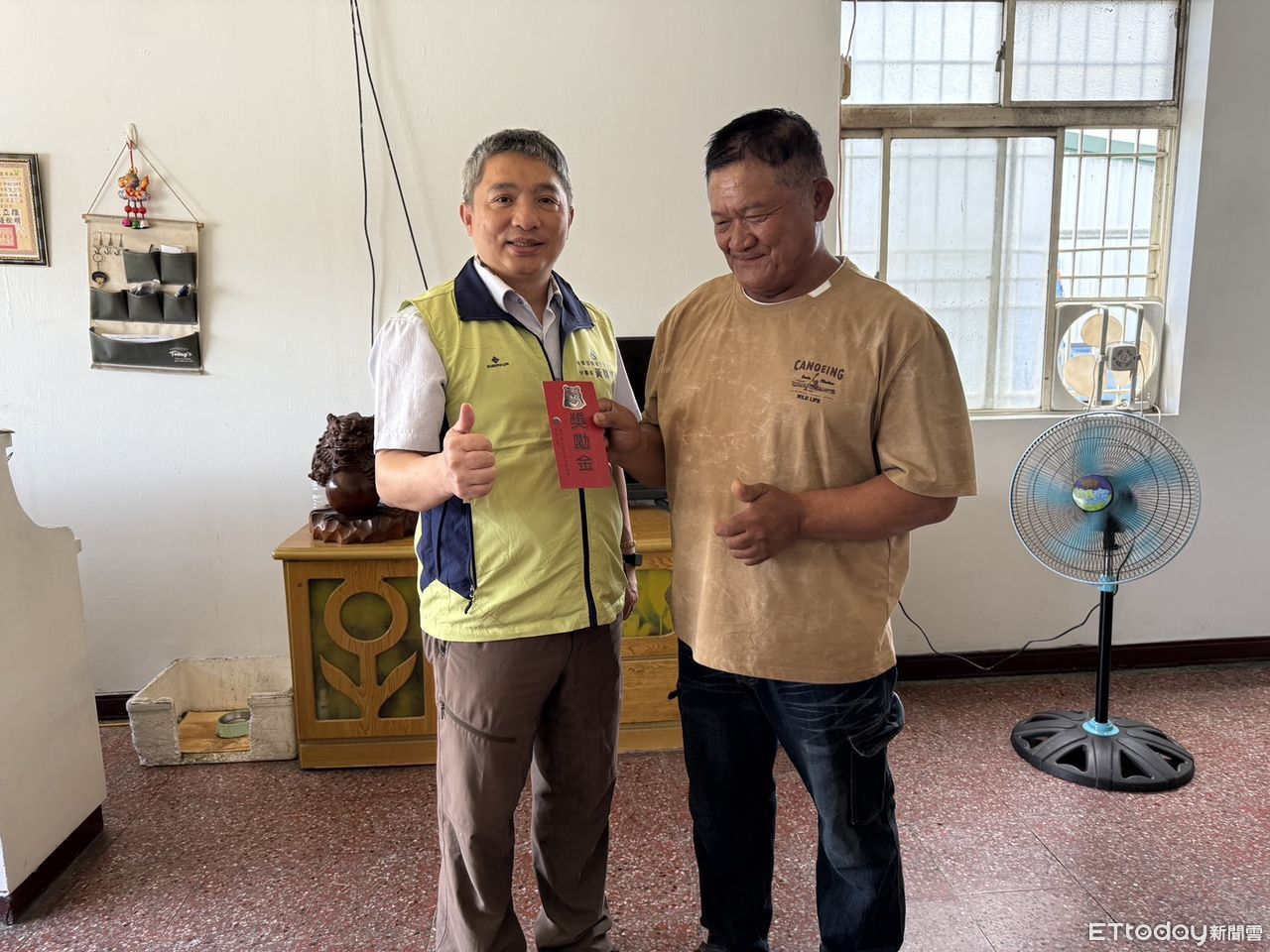 ▲施姓族人(右)開心接受獎金表示,做好事會有好運氣。