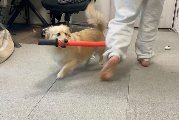 在泡棉武士刀之前,山藥泥最喜歡的玩具則是一個藍色咬咬繩,還會主動叼著過來找爸爸陪玩。X平台的網友看見這隻可愛的「阿金武士」,紛紛被萌到融化,「我想被砍,好可愛」、「刀是武士的生命線!」、「嗯,這絕對是刀王」。