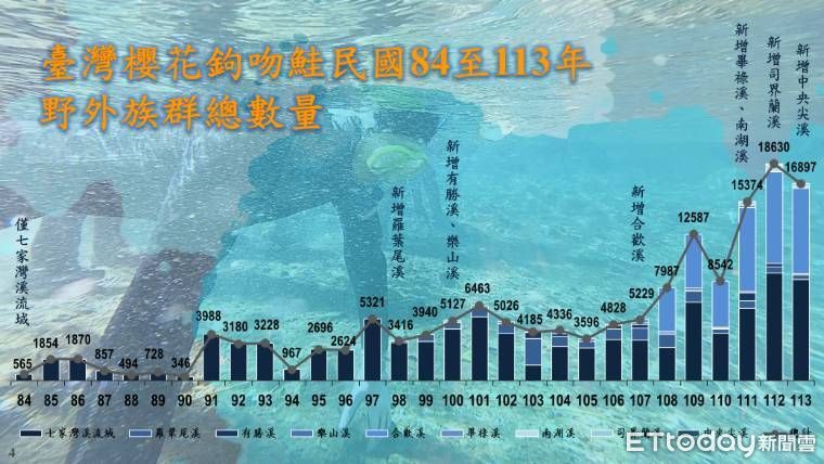 雪霸處長林文和說,臺灣特有珍貴的國寶魚—臺灣櫻花鉤吻鮭,經過多年來的復育,野外的族群量從最初的200多尾,近年來快速成長有1萬8千多尾,族群穩定成長,而且棲地也從七家灣溪擴展到其他周邊溪流,保育成效相當豐碩。