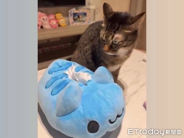 台中市的7歲米克斯貓「咪咪」,是超級外向的毛孩。這天奴才買了一個「咖波」造型的絨毛衛生紙套,卻發現三不五時頂部會濕濕的,甚至有衛生紙屑的殘留。直到有天偶然撞見咪咪居然在幫它舔毛,才驚覺原來貓造型的咖波被當成新成員,出於母愛才會讓咪咪想照顧梳理,可愛的瞬間笑翻家人。
