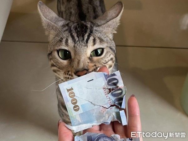 桃園市1歲的豹貓「Teemo摩醬」非常調皮,這天奴才到家後睏意瞬間來襲,累得倒頭就睡,不料醒來後發現桌上的千鈔被Teemo咬得四分五裂。媽媽將破碎的鈔票拼起來拿回犯案現場,沒想到當事喵還露出一臉不服氣的表情,囂張的態度讓一家人哭笑不得。