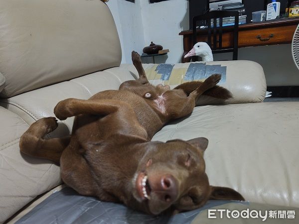 躺在沙發上的money睡到肚皮朝天,嘴開腳也開的形象大崩壞,完全沒注意到阿輝似乎打算幹壞事。網友「習東寧」與《ETtoday寵物雲》分享,鵝子阿輝是家裡的小霸王,「看誰都不順眼,看到誰都想去欺負一下,每天都很熱鬧」,攻擊狗狗更是牠每日必做的事情之一,總是被啄的money則是位好好先生,「我家的狗都會讓鵝欺負牠,真的受不了才會假裝生氣一下」。